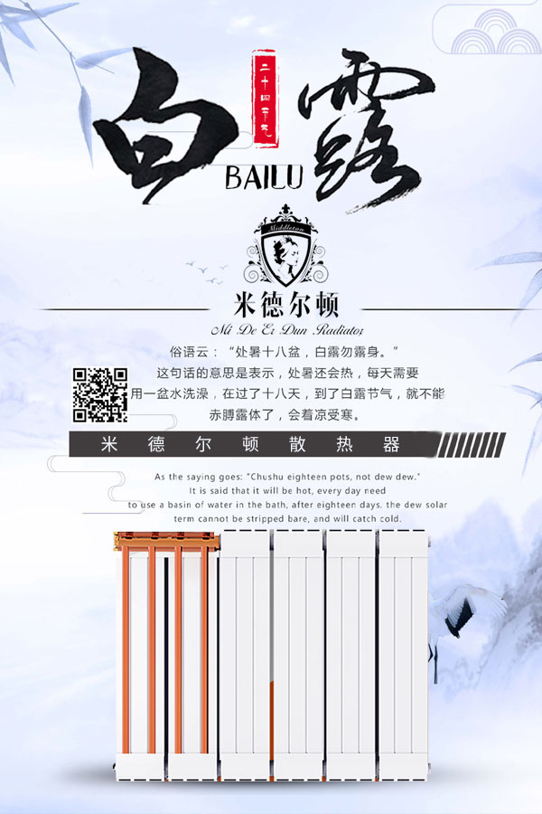 蒹葭蒼蒼,白露為霜。所謂伊人,在水一方。2020年9月7日庚子年七月二十,迎來二十四節氣中的第十五個節氣——白露。白露往后,氣候漸漸轉涼,這個時候裝置暖氣片是明…